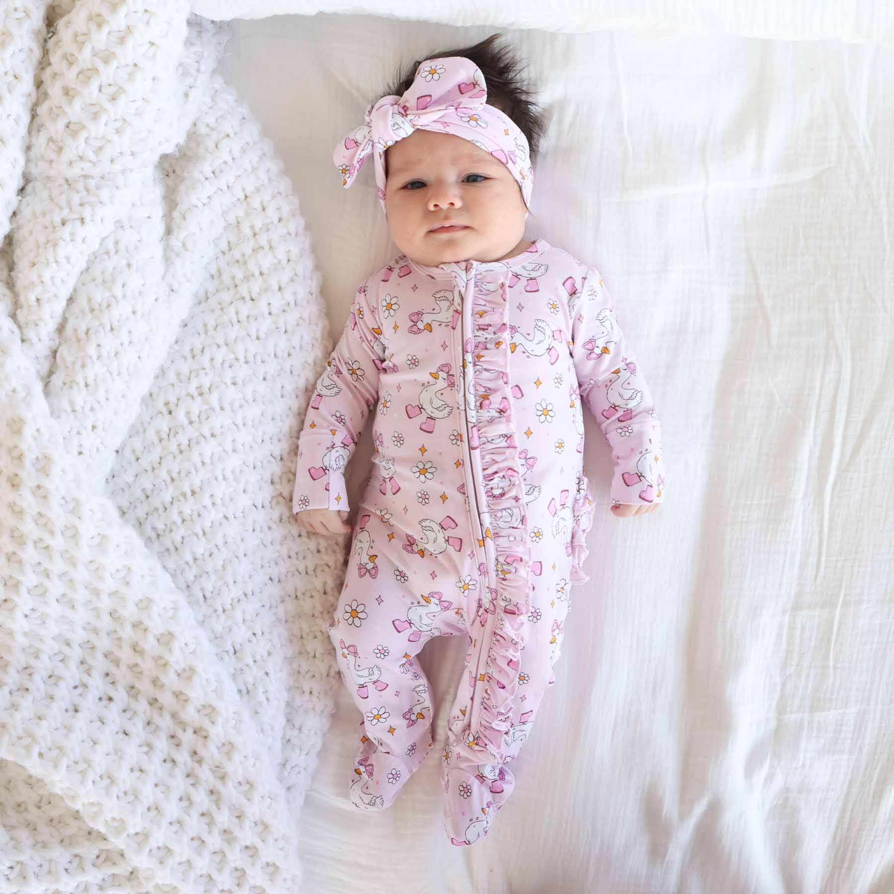 Top off her look with a bow that’s just as silly and sweet as she is! Our Silly Goose Knit Bow Headwrap in dreamy pink is the perfect finishing touch for your little one's outfit. Made from soft, stretchy knit fabric, this bow headwrap is gentle on delicate newborn skin and comfy enough for all-day wear. This bow headwrap features our pink Silly Goose print, where whimsical geese in pink rain boots, big pink bows, sparkles, and daisies waddle their way into your heart. Designed to match perfectly with our footies, pajamas, swaddles, and accessories, this headwrap adds a pop of playful charm to any look. It’s the cherry on top of the cutest little outfit!
