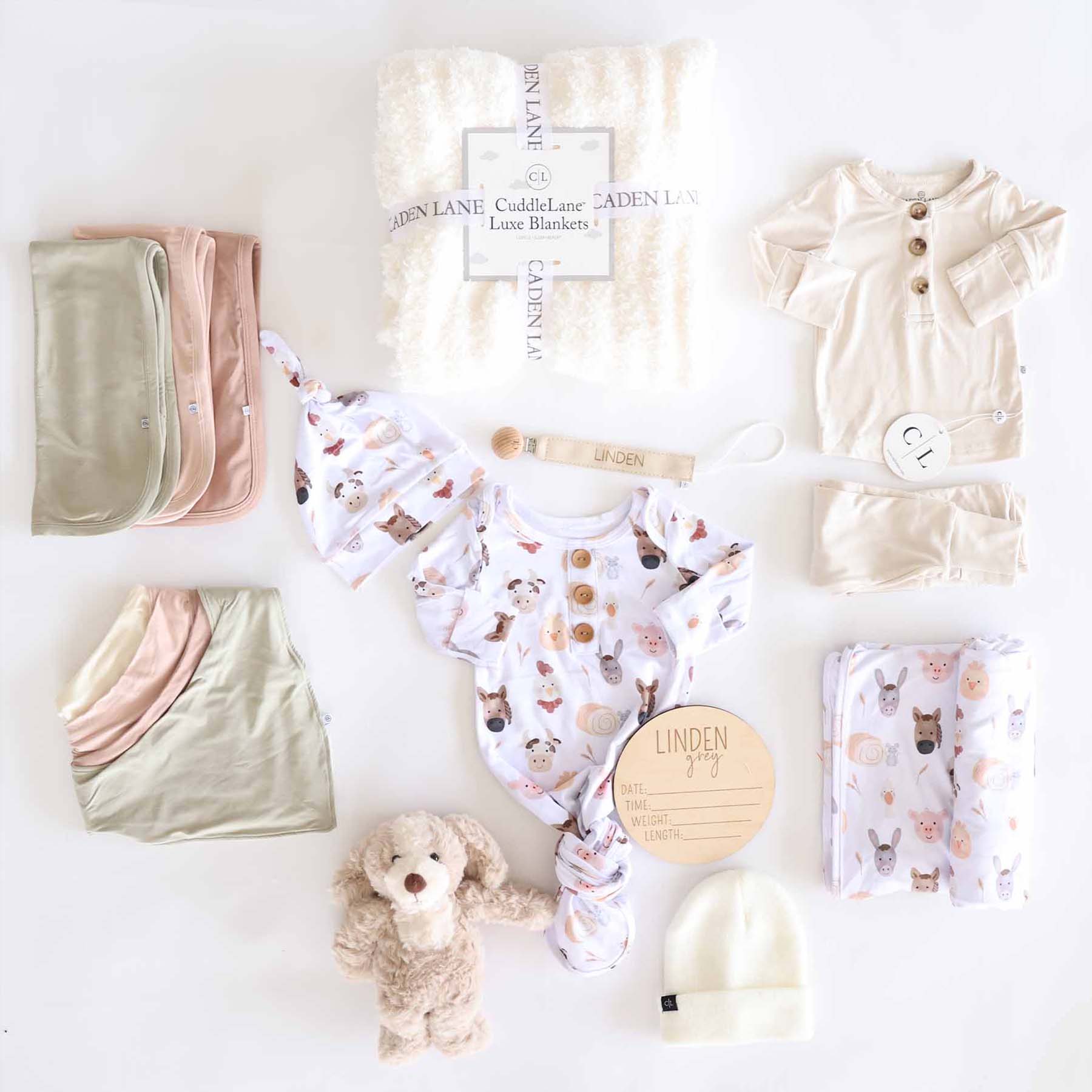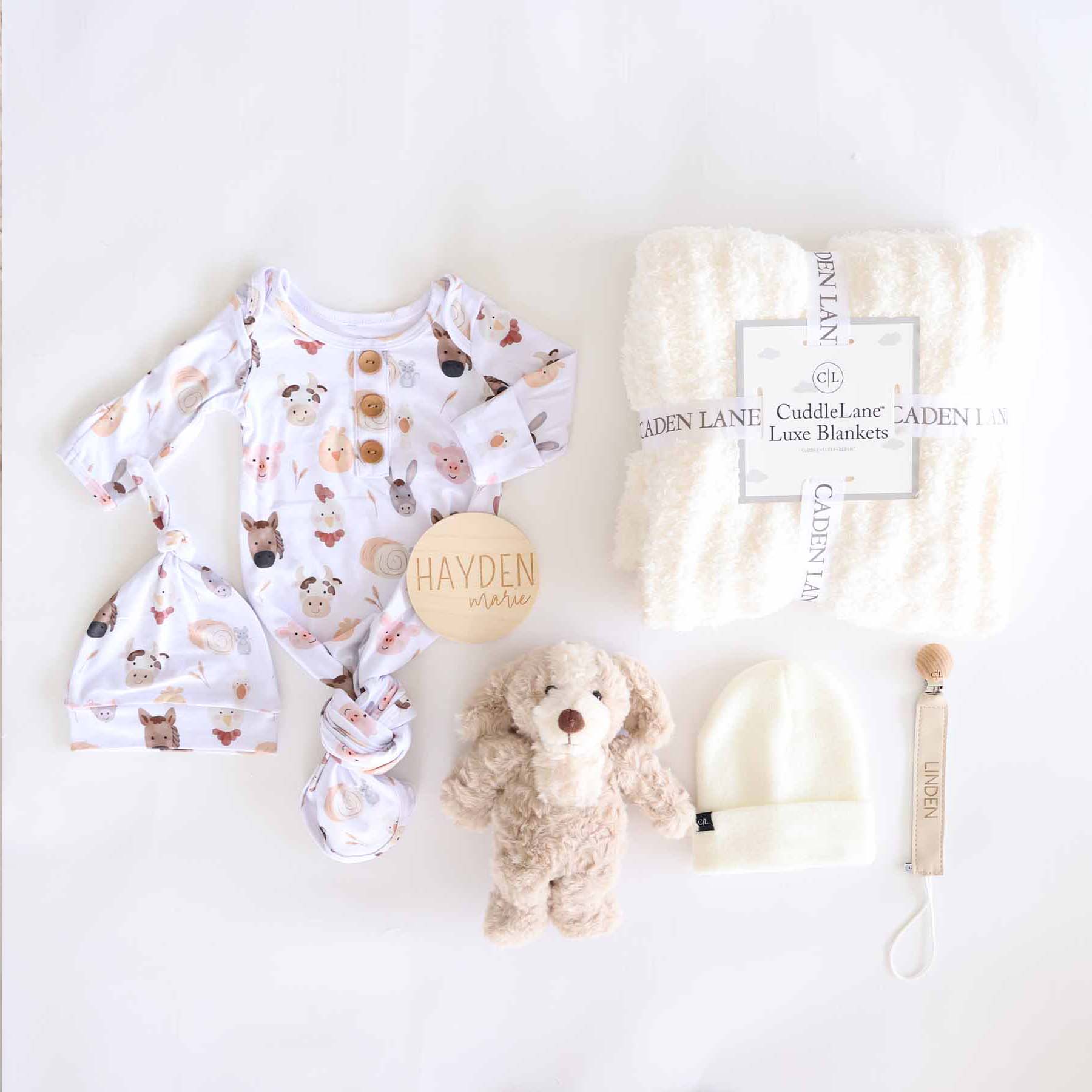 A dreamy, neutral baby shower gift that’s packed with love! This high-end barnyard themed baby shower box is filled with cozy, versatile essentials for any little bundle of joy. Each box is carefully packaged by our Texas team and filled with luxury bamboo babywear, plush blankets, and personalized keepsakes for the most memorable first moments. From buttery-soft bamboo outfits and swaddles to a luxe baby blanket and hooded towel, these sets bring comfort and convenience to new parents. With personalized touches complete with baby's name, this gift is as unique as the little one it’s celebrating. Whether it's a surprise gender reveal or just a love for neutrals, this set is the perfect way to say, "Welcome, baby!"