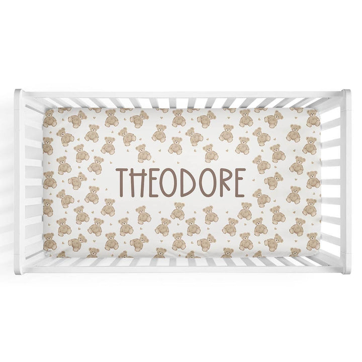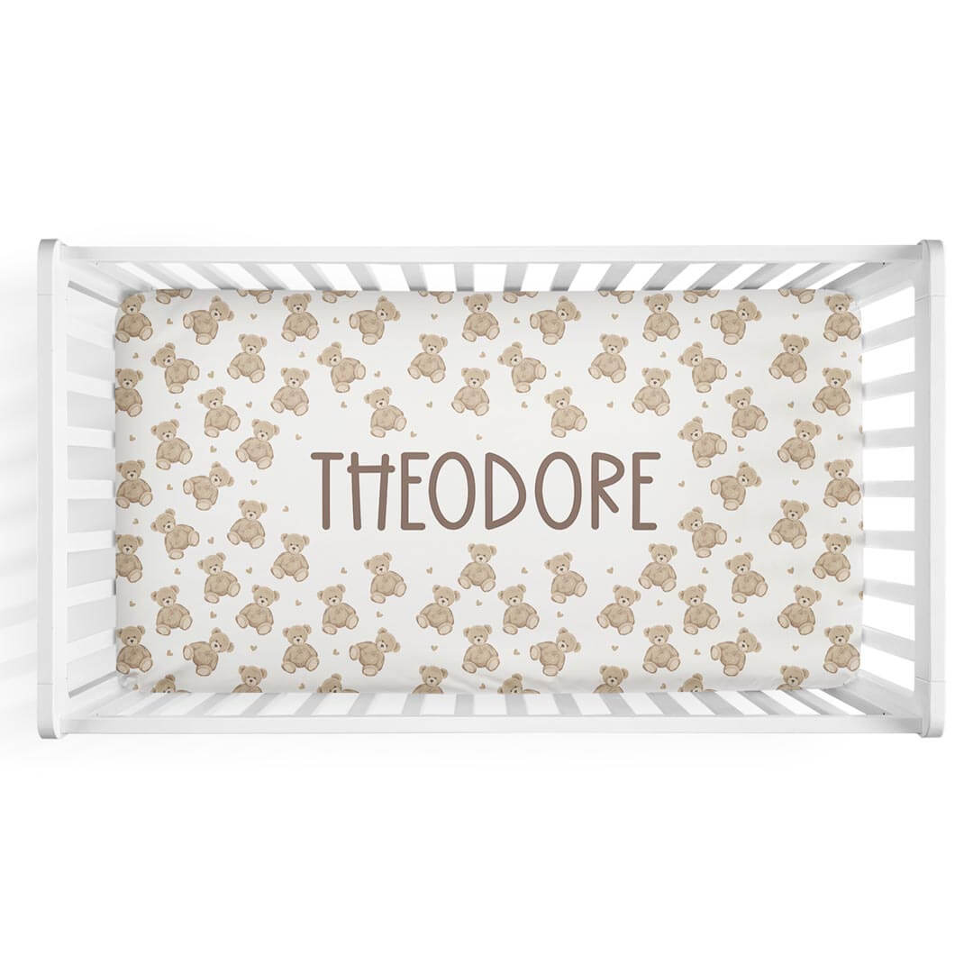 Snuggle up in sweetness with our Beary Sweet Personalized Crib Sheet—the perfect cozy addition to your baby’s nursery! Made from our signature bamboo viscose fabric, this crib sheet is buttery soft, ultra-breathable, and stretchy enough to fit standard crib mattresses like a dream. It’s gentle on delicate skin and ideal for year-round comfort, keeping your little one cozy through every nap and nighttime snuggle. With adorable teddy bears and tiny brown hearts, this crib sheet is as cute as it is cuddly. Personalize this crib sheet with your baby’s name to make it a meaningful keepsake and standout piece in any nursery. Whether you're going for a neutral nursery theme or something sweet and classic, this personalized crib sheet is the perfect touch!