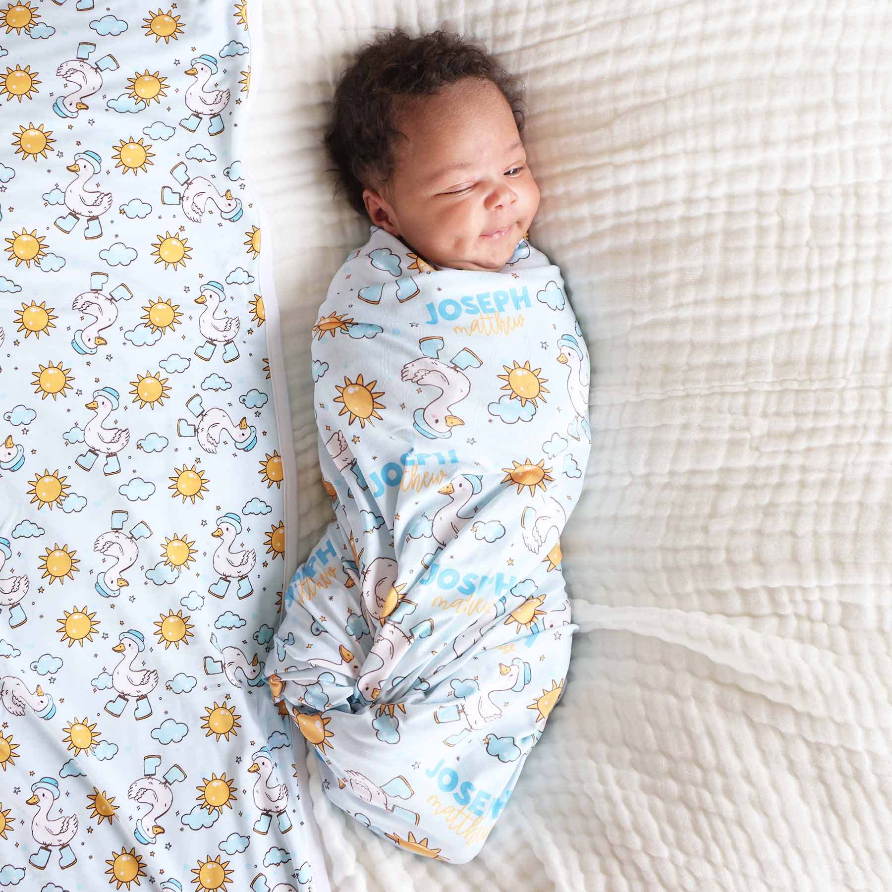 Wrap them up in softness, silliness, and a little splash of sunshine! Our Silly Goose Personalized Swaddle Blanket in sky blue is the snuggly staple every baby needs. Made from buttery-soft, breathable fabric, this lightweight swaddle is perfect for keeping your little one cozy from their very first days. Featuring our blue Silly Goose print, this swaddle blanket is sprinkled with sunshine, fluffy clouds, and the silliest geese you ever did see—marching along in floppy rain boots and top hats. This swaddle is personalized with your baby’s name, creating a one-of-a-kind keepsake that’s as unique as your little one. Whether you’re swaddling for sleep, spreading it out for tummy time, or tossing it over the stroller on a sunny day, this versatile blanket is the ultimate blend of softness, sweetness, and silliness.
