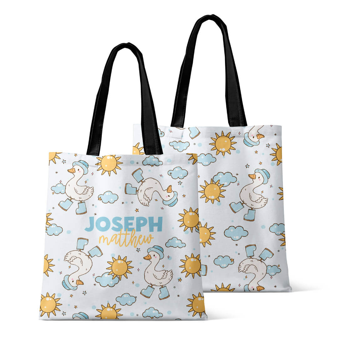 For the kid who has places to go and very important treasures to carry—our Silly Goose Personalized Tote Bag in sky blue is the perfect sidekick for every little adventure. Whether they’re off to preschool, the library, a sleepover, or just the backyard, this adorable tote brings silly style and sweet functionality wherever they waddle. Made from durable, lightweight fabric and designed with little hands in mind, this tote bag is perfectly sized for books, snacks, toys, and all of your little one's favorite things. The blue background is sprinkled with our Silly Goose print—playful geese in rain boots and top hats between sunny skies and puffy white clouds for a sweet and silly look. Add your child’s name for a one-of-a-kind bag they’ll love to carry around (and won’t lose at school!) From carrying bedtime books to packing their favorite stuffed goose, this personalized tote is the ultimate mix of cute, practical, and oh-so-silly.
