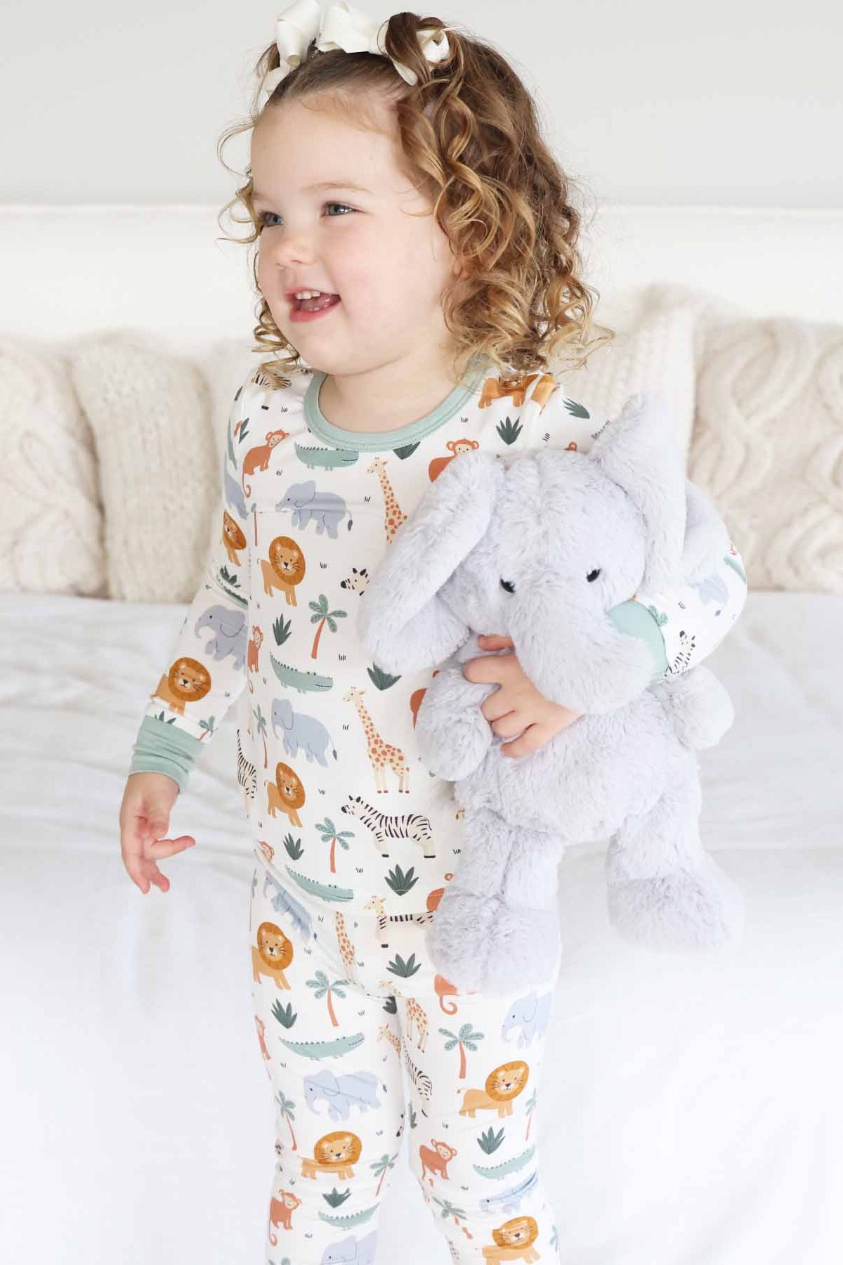 Bedtime turns into a wild adventure with the Safari Snuggles Two Piece Pajama Set! Made from soft and stretchy bamboo fabric, this set keeps your little one comfy through story time, sweet dreams, and early morning snuggles. The cute-as-can-be Safari Snuggles print is filled with gentle lions, elephants, and giraffes on a creamy white background that is both playful and timeless. The snug fit keeps kids cozy all night while the two piece style makes bedtime routines and quick changes a breeze. Perfect for matching with siblings or snuggling up on family nights, these pajamas bring comfort and cuteness together in the sweetest way!