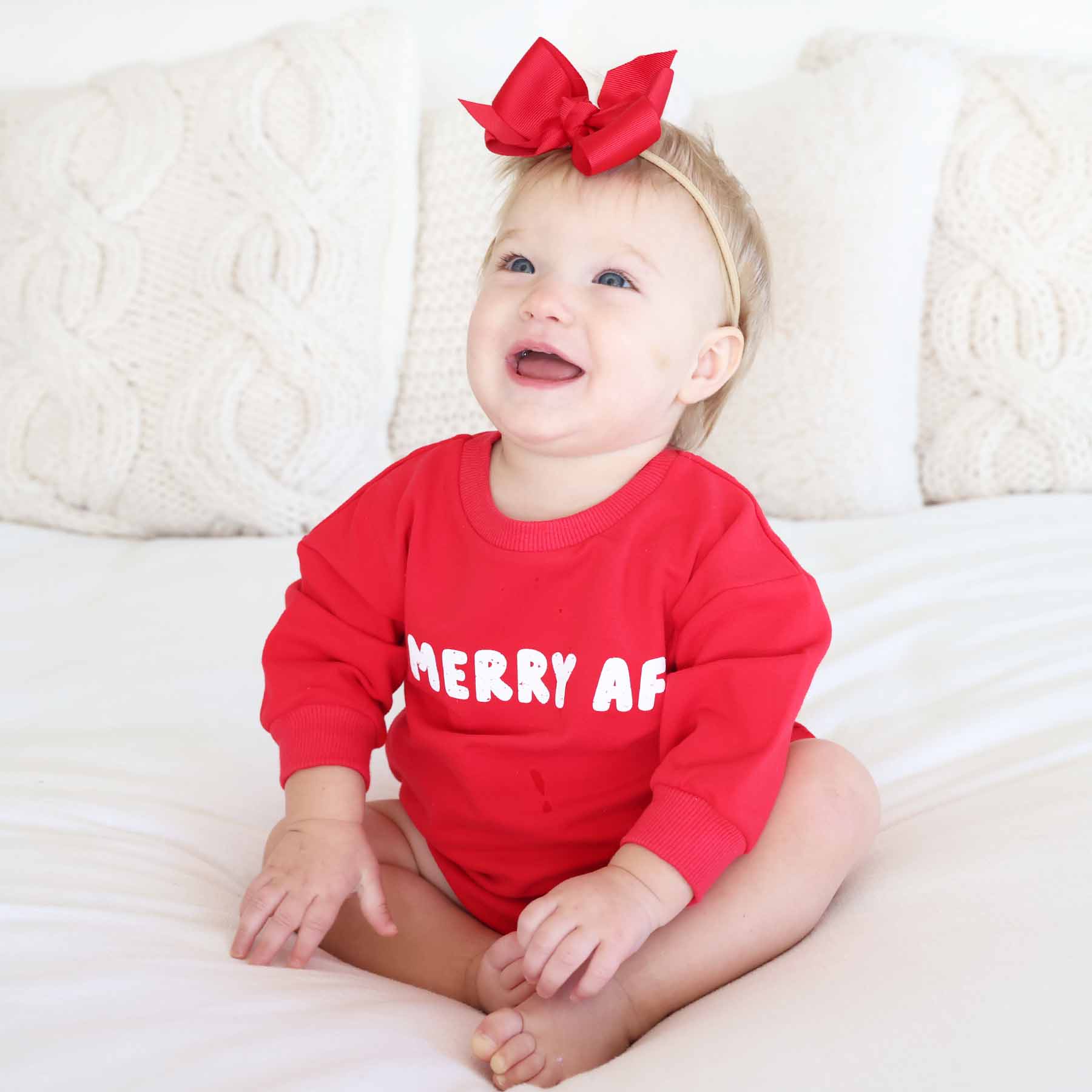 Keep your little elves toasty all winter while spreading holiday cheer in these Christmas sweatshirt bubble rompers! Featuring jolly sayings like "Sorry Santa, I drank the milk" and "Merry AF", these cozy rompers are sure to bring lots of laughs and festive fun. Made to keep them warm and snug all season long, itâs the perfect outfit for cozying up by the fire or heading out for holiday adventures. Whether theyâre on Santaâs naughty or nice list, these berry red long sleeve rompers will have them in the Christmas spirit!