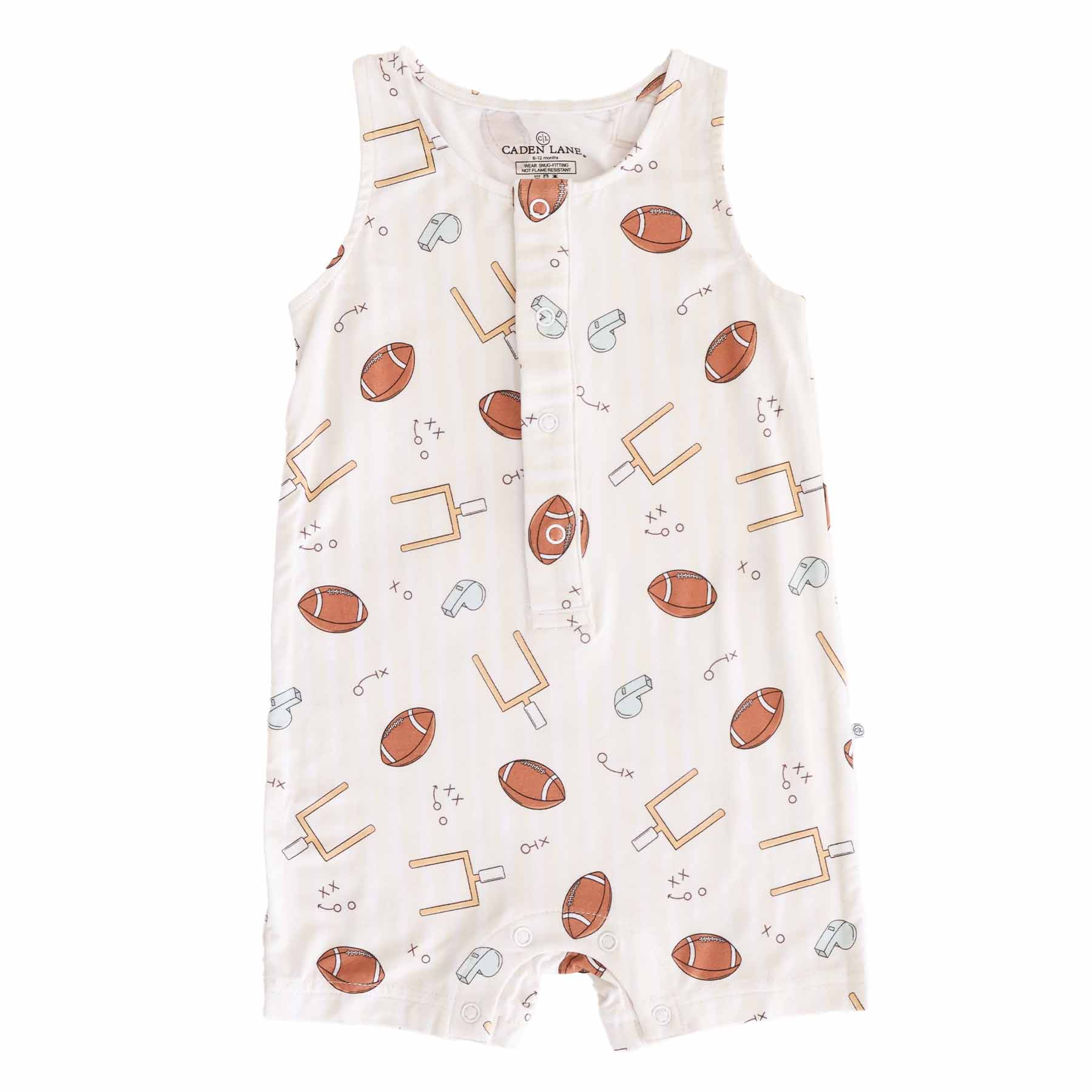 caden lane bamboo viscose sleeveless short snap romper football themed