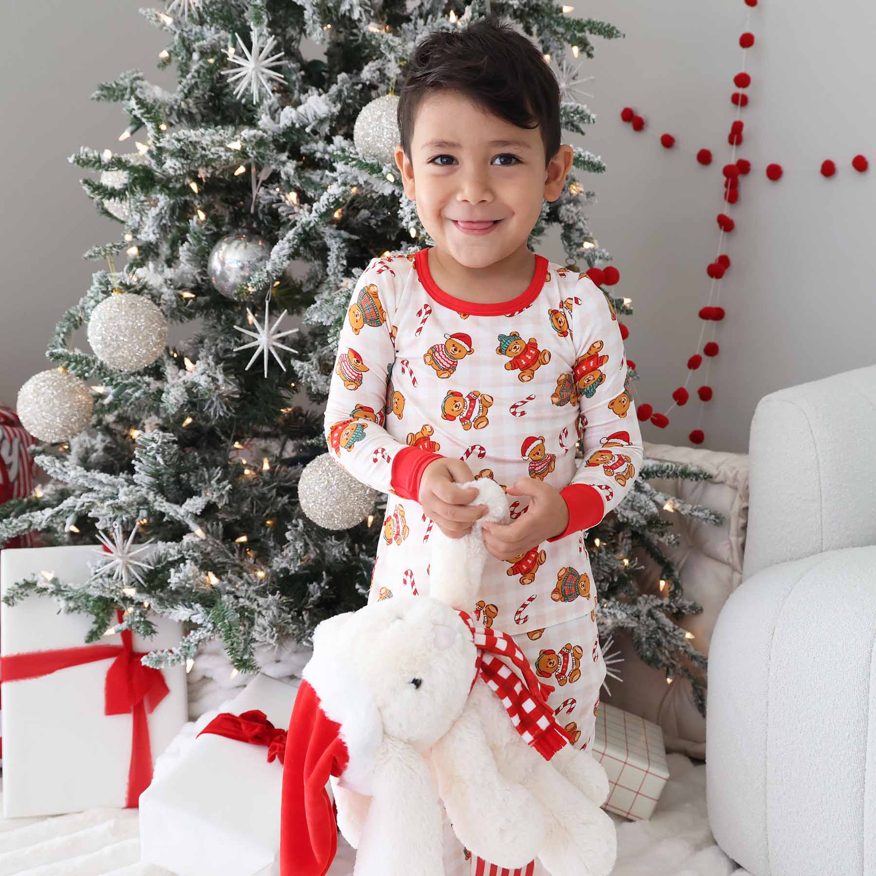 Make Christmas mornings even cozier with our Beary Christmas Two-Piece Pajama Set! This cheerful print features teddy bears dressed in festive sweaters, Santa hats, and ear muffs, all surrounded by candy canes and holiday cheer on a warm gingham backdrop. Made from buttery bamboo fabric, these pajamas are soft, stretchy, and breathable, keeping kids comfy through tree trimming, cookie decorating, and unwrapping presents. The long-sleeve top and matching bottoms are designed for all-night comfort and all-day play, so they’re perfect for both sleeping and celebrating. Whether worn for holiday photos, festive movie nights, or a cozy morning with cocoa by the fire, these PJs bring the magic of Christmas to every cuddle and giggle.