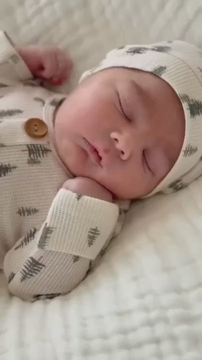 Welcome your baby home in cozy woodland style with our Evergreen Bamboo Waffle Newborn Knot Gown & Hat Set! Featuring a forest of hand-painted pine trees on a creamy neutral background, this set captures the charm of crisp fall mornings and snuggly nights in. Made from our soft, breathable bamboo waffle fabric, this gown is gentle on delicate skin and stretches just enough for all-day comfort. The knotted bottom makes late-night changes quick and simple, while the matching hat keeps tiny heads warm while completing the look. Perfect for first photos, baby showers, or everyday snuggles, this set is the sweetest look for those earliest first days home.