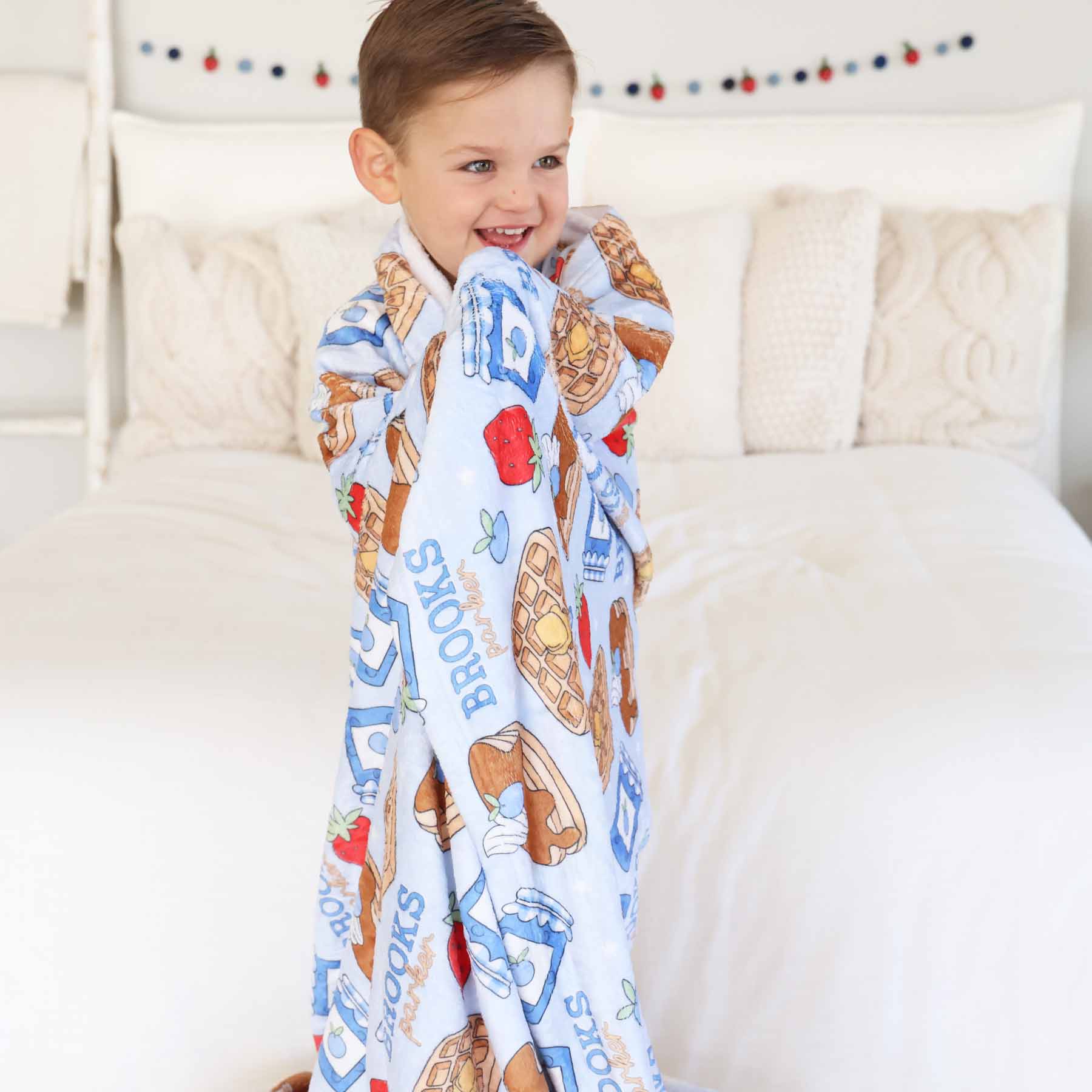 Pile on the comfort with the Sweet Stacks Personalized Kids Blanket! Sprinkled with fluffy pancakes, golden waffles and jars of jam, this blanket is a recipe for cozy nights and sweet snuggles. Made from a velvety minky fabric, it’s buttery soft, breathable, and perfect for keeping little dreamers comfy year-round. Add your child’s name for a personalized touch that makes this blanket as one-of-a-kind as their favorite breakfast treat.