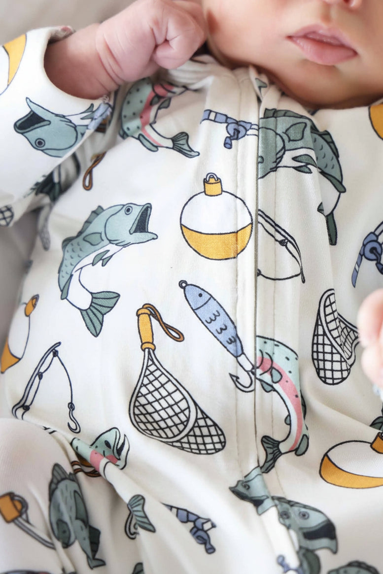 Hook the cutest look for your baby with our Catch of the Day Zipper Footie! Made from buttery-soft and breathable bamboo viscose, this one-piece pajama is perfect for sleepy snuggles, playtime at the cabin, or lakeside lounging. Featuring our Catch of the Day print with playful bass, bobbers, and all the charming details of a day on the water, this fishing-themed footie is a must-have for your little angler. Designed with convenience and comfort in mind, our zipper footie features a two-way zipper for quick and easy diaper changes. Built-in footies keep little toes warm and cozy, while fold-over mittens help prevent accidental scratches. The naturally stretchy bamboo fabric is breathable, moisture-wicking, and gentle on delicate baby skin, making it ideal for day or night, year-round. Whether you’re cuddling on the couch or packing up for a weekend at the lake, this zipper footie is the perfect blend of function, comfort, and adorable outdoor style.