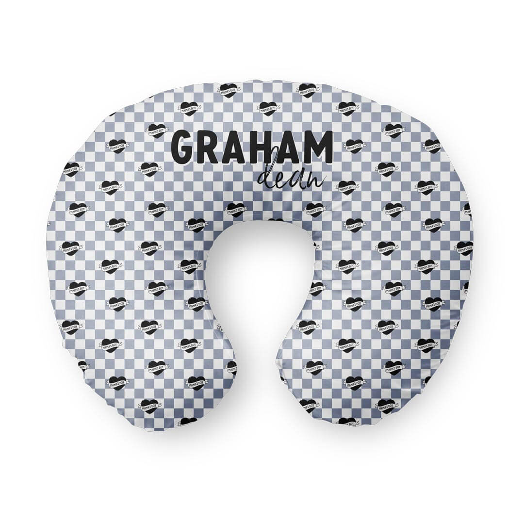Feedings, snuggles, and sleepy cuddles just got a whole lot sweeter! This dusty blue and white checkered nursing pillow cover is sprinkled with bold black hearts that say “mama’s boy” — a loving nod to every boy mom's favorite little guy. Personalized with your baby’s name, this personalized nursing pillow cover brings a custom touch to those everyday moments, whether you're nursing, bottle-feeding, or just soaking in the baby snuggles. It’s cute, cozy, and makes every feeding feel like a moment worth remembering. Made from super soft, stretchy fabric that’s gentle on your baby’s skin and easy to zip off for washing, it fits most standard nursing pillows and stays in place through every cuddle and coo.