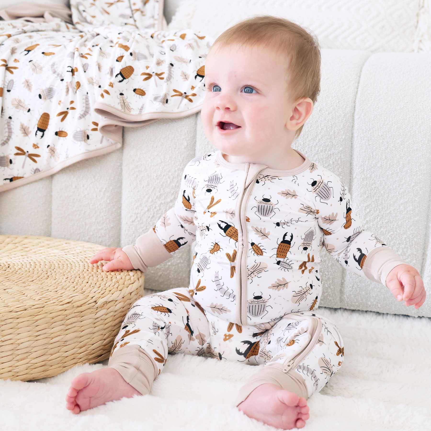 Little explorers, get ready to wiggle, crawl, and snuggle in our Snuggle Bug Convertible Zip Romper! Covered in a cheerful mix of beetles, dragonflies, caterpillars, and mushrooms, this playful print brings a love for nature to life in soft earthy tones. Made from a smooth, stretchy bamboo blend, this romper is perfect for all-day comfort and all-night sleep. The convertible footie design lets you switch between footed and footless in a snap, while the two-way zipper makes diaper changes quick and easy. Fold-over mittens on smaller sizes keep little hands warm and safe from scratches. It’s the ultimate one-piece for snuggling, stretching, and showing off your favorite little bug.
