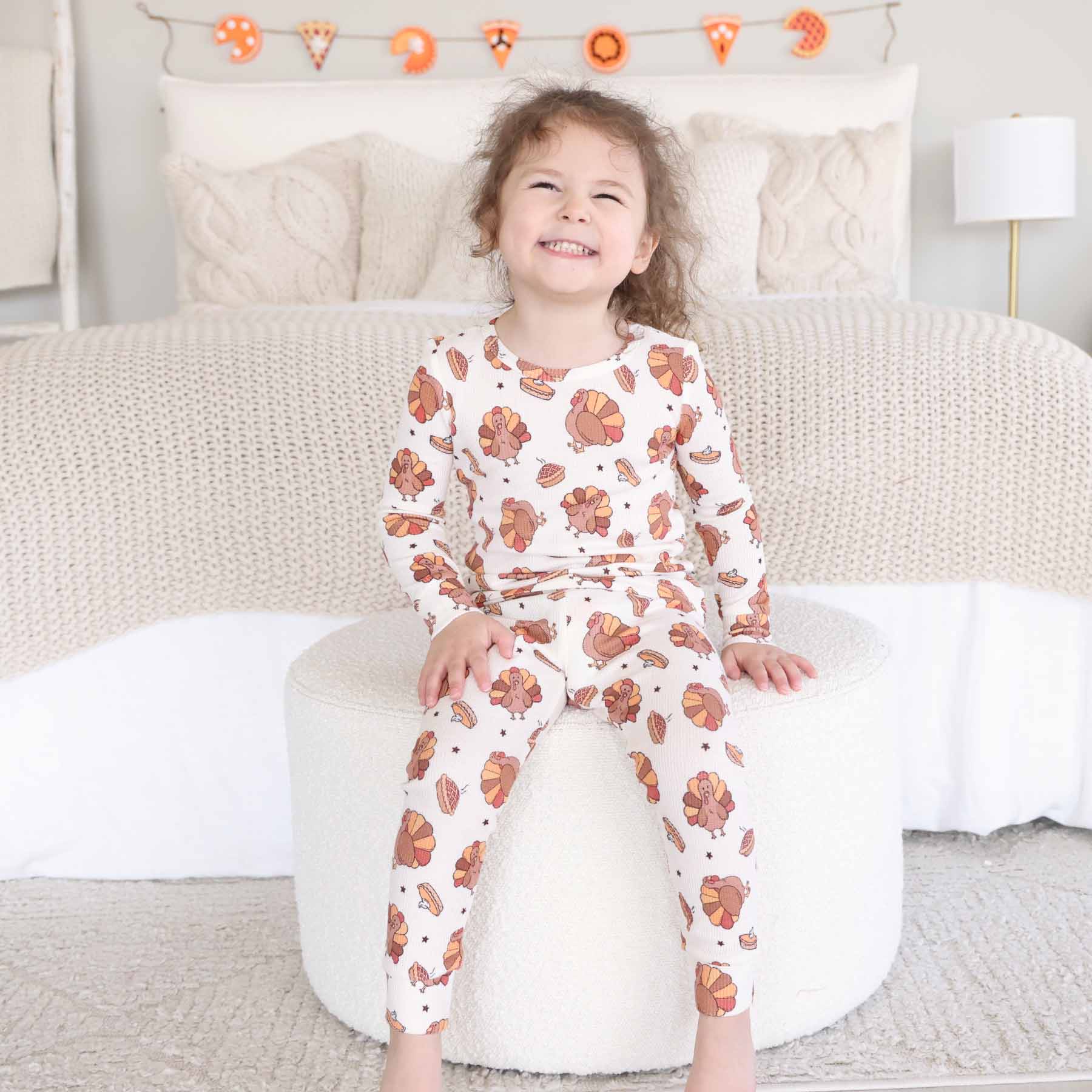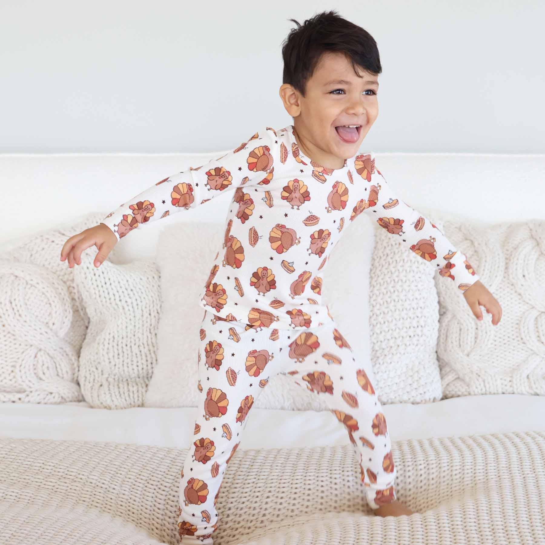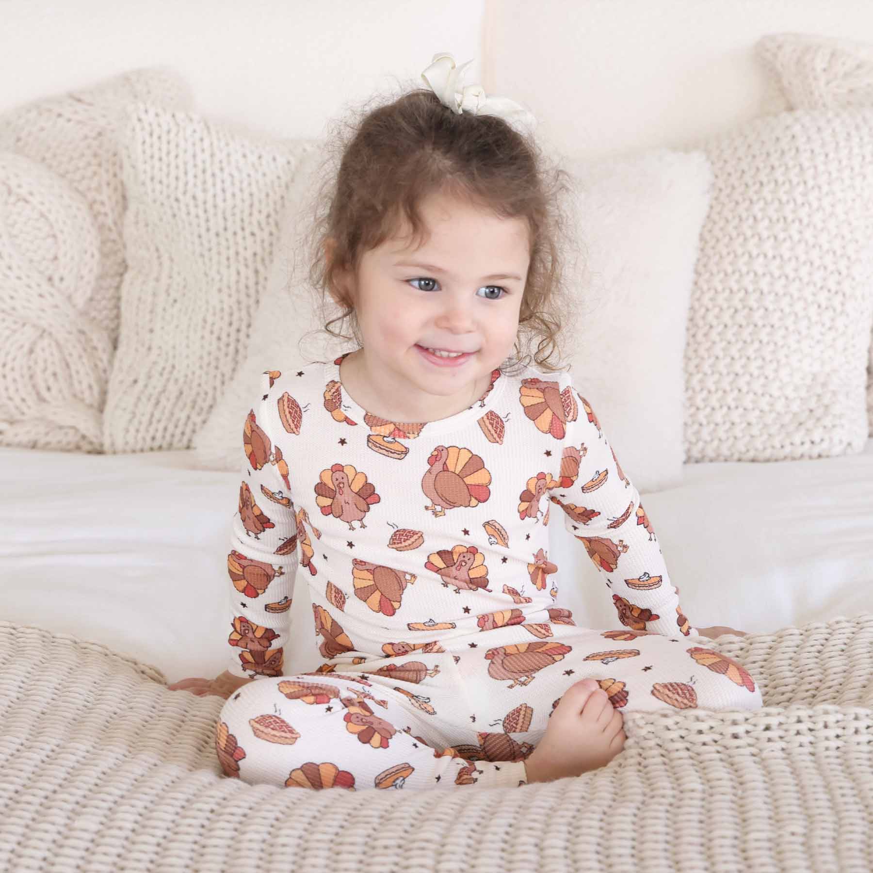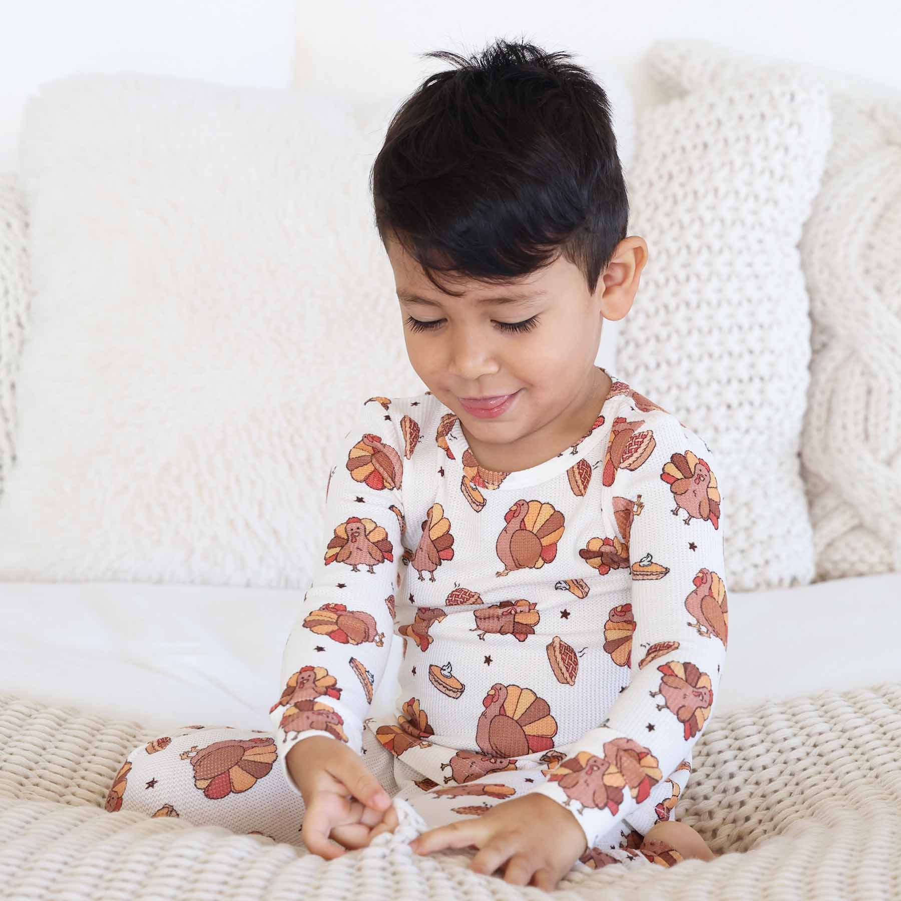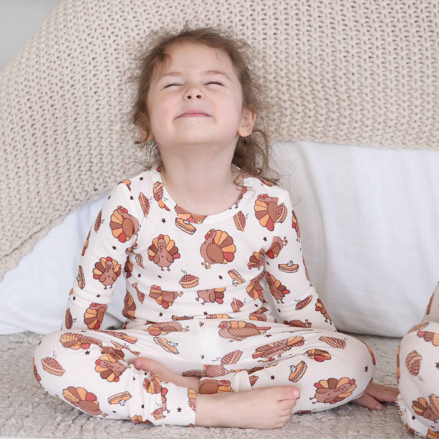 Your little turkey will be ready to gobble up the fun in our Turkey Treats Two-Piece Pajama Set! Sprinkled with turkeys, pumpkin pies, and twinkling stars, this cheerful print is the perfect recipe for Thanksgiving cuteness. Made from buttery bamboo waffle fabric, these PJs are soft, stretchy and perfect for every holiday adventure. The long-sleeve top and matching bottoms keep kids comfy whether they’re helping mash the potatoes or sneaking that extra slice of pie. Perfect for family photos, cozy nights, and post-feast snuggles, these pajamas are a Thanksgiving must-have your little one will love wearing year after year.