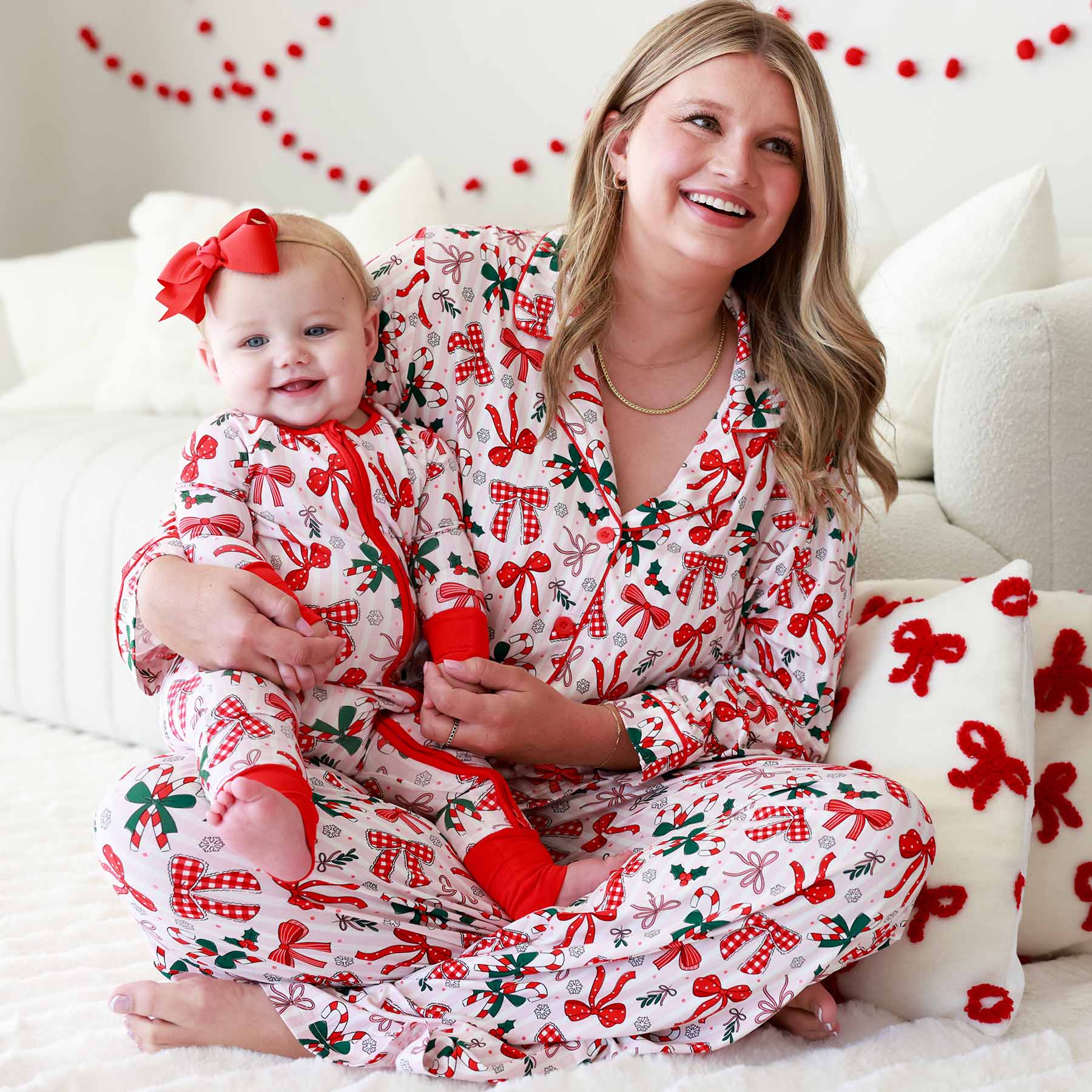 Cozy meets cute with our Bow What Fun Women’s Two-Piece Flare Lounge Set! Designed with festive red bows, candy canes, holly sprigs, and snowflakes on playful pink stripes, this set is the perfect match for the holidays. The button-up collared top brings a tailored look, while the relaxed flare pants keep the vibe effortless and comfortable. Made from buttery bamboo viscose, this set is lightweight, breathable, and soft enough to live in all season long. Whether you’re wrapping presents, sipping cocoa by the fire, or matching with the kids on Christmas morning, it’s the holiday outfit you’ll look forward to wearing again and again!