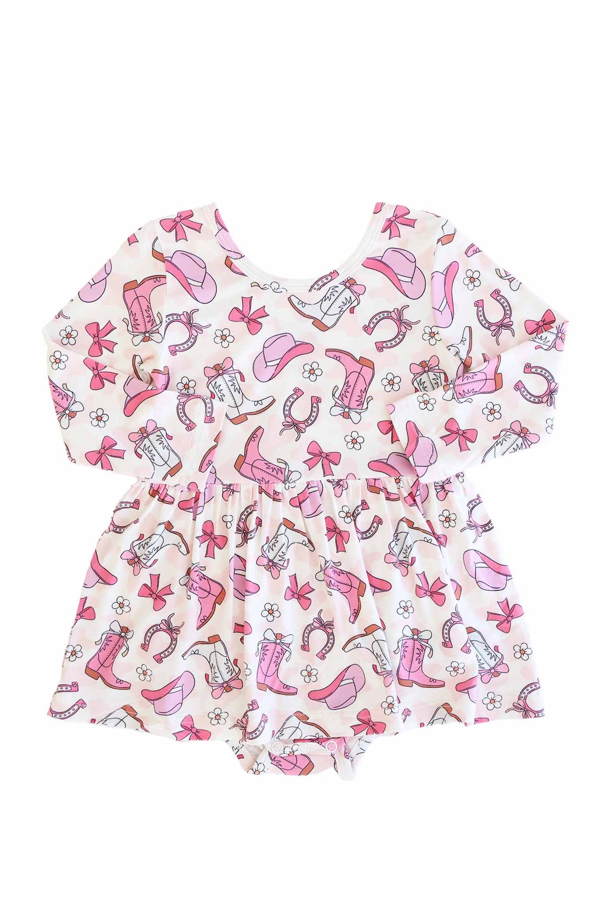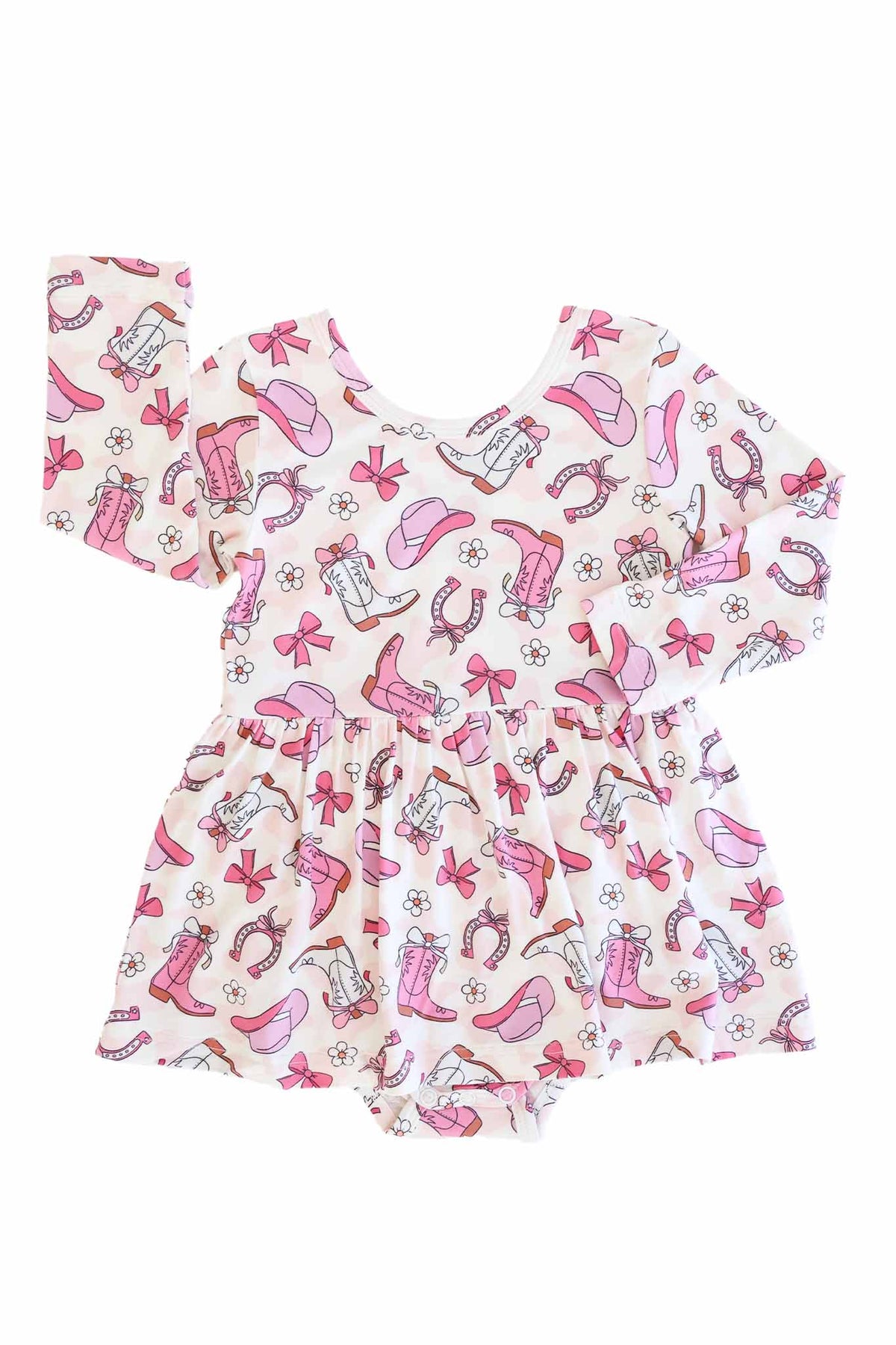 The Rodeo Dreams Long Sleeve Twirl Bodysuit is made for little cowgirls who love to spin, stomp, and steal the spotlight. With the sweetest pink western print and a flowy twirl skirt built right in, this one-piece outfit is equal parts comfy and cute, perfect for playdates, picture days, and everyday adventures. Soft and stretchy for all-day wear, it keeps her cozy with long sleeves while still feeling light and easy to move in.