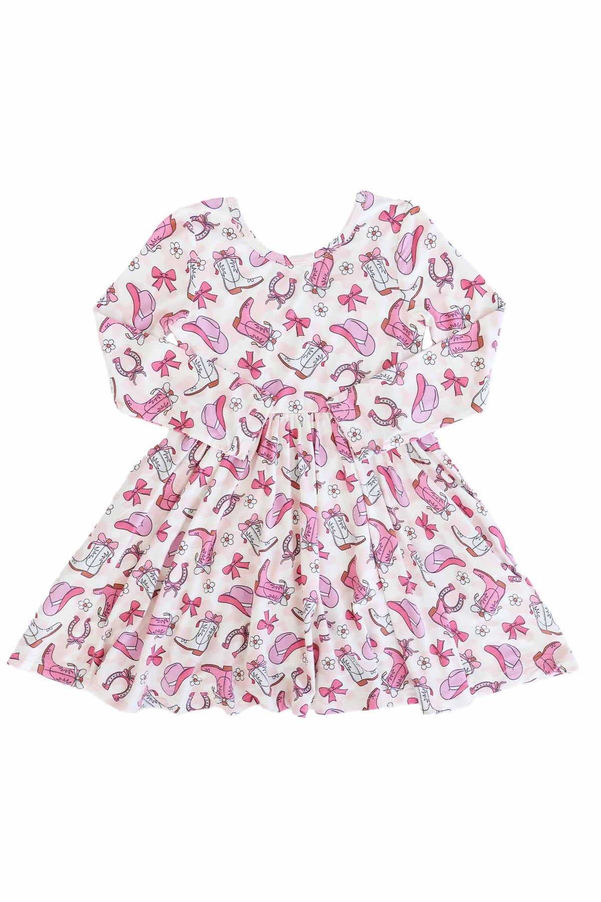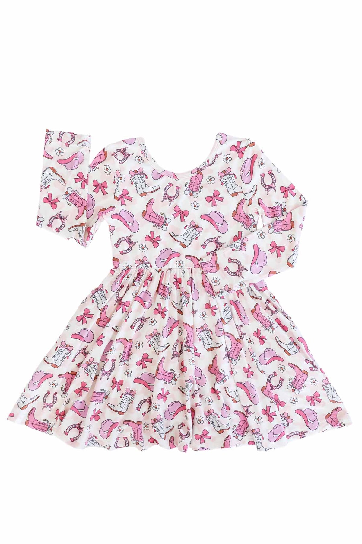 long sleeve twirl dress for girls in pink rodeo dreams print