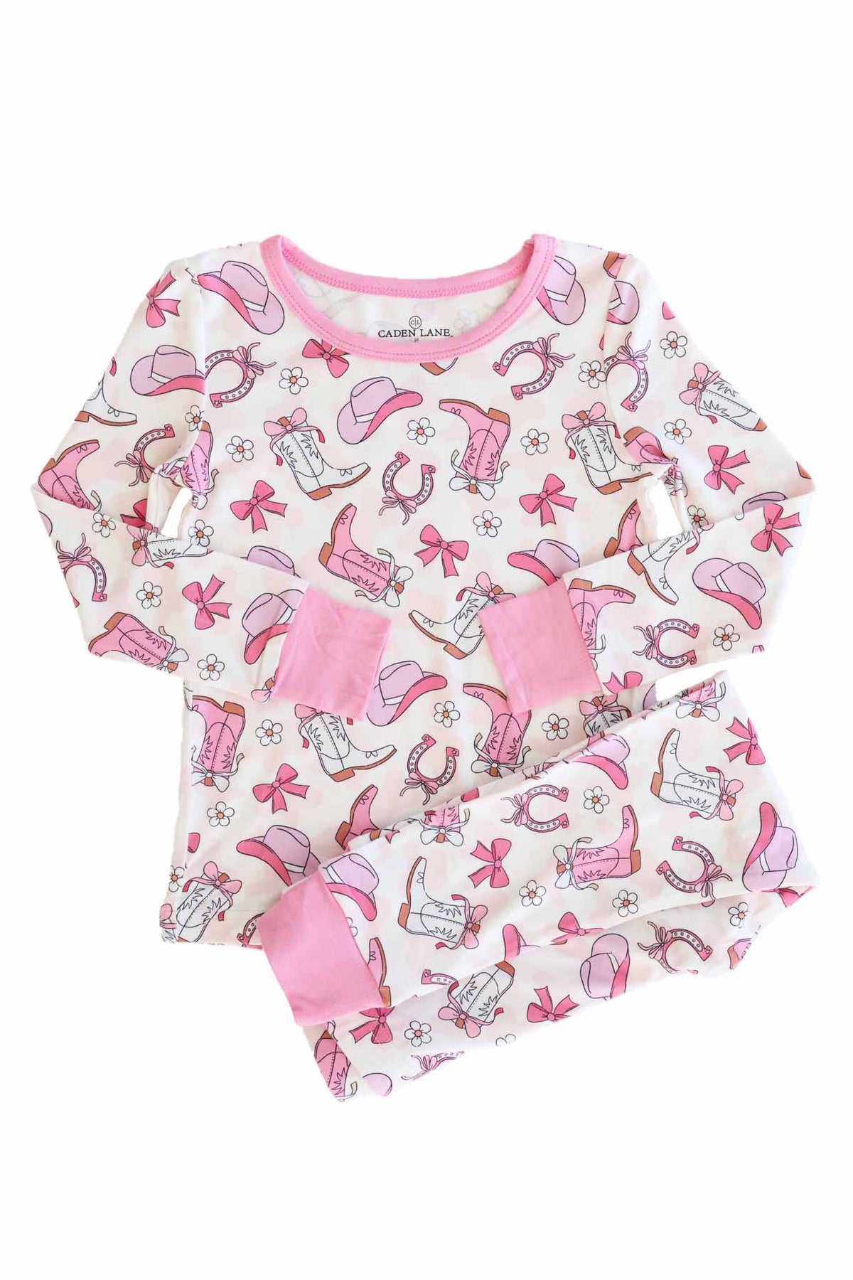The Rodeo Dreams Two Piece Pajama Set in pink is made for little cowgirls who like their bedtime comfy with a touch of western charm. The playful print features pink boots, bows, lucky horseshoes, and dainty daisies that brings a girly touch to the classic western look. With a long sleeve top and matching pants, this set is soft and stretchy for easy movement, whether she’s winding down with a story, curled up for movie night, or moseying into the kitchen the next morning. Cozy enough for sleeping and cute enough for lounging, it’s the kind of pajama set that gets worn on repeat.