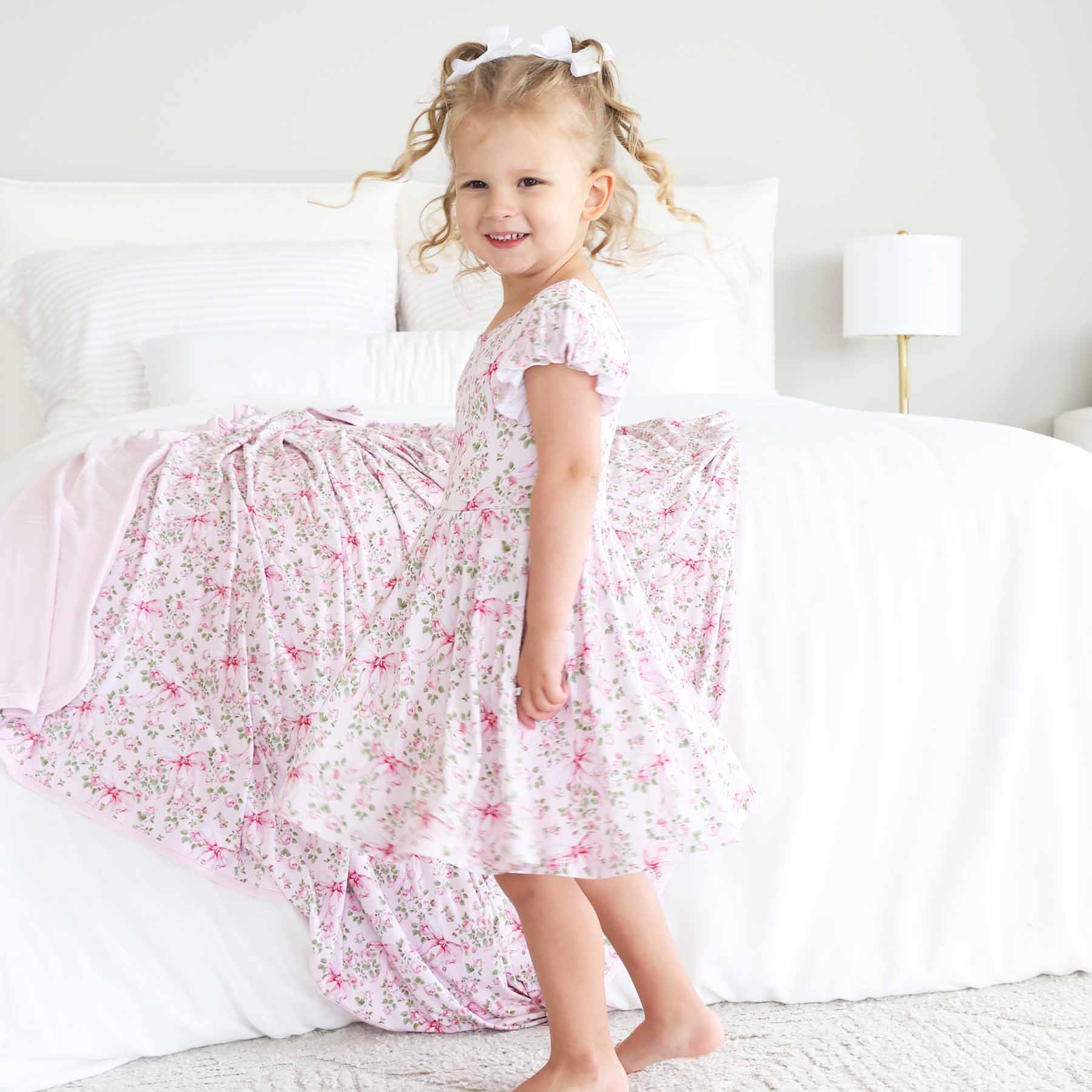 Pretty, playful, and made for twirling, the Bows in Bloom ruffle twirl dress is full of charm. With short sleeves and a knee-length skirt, this dress is perfect for playdates, parties, and all the in-between moments that call for a little extra sweetness. Made from buttery-soft bamboo viscose, it’s lightweight, breathable, and gentle on sensitive skin so she can twirl, dance, and run around in total comfort. The soft pink floral and ribbon bow print adds just the right amount of vintage-inspired flair that every girly girl will love to wear. It’s a favorite for dress-up days and everyday wear. This dress is sweet, simple, and sure to be an outfit she'll reach for again and again!
