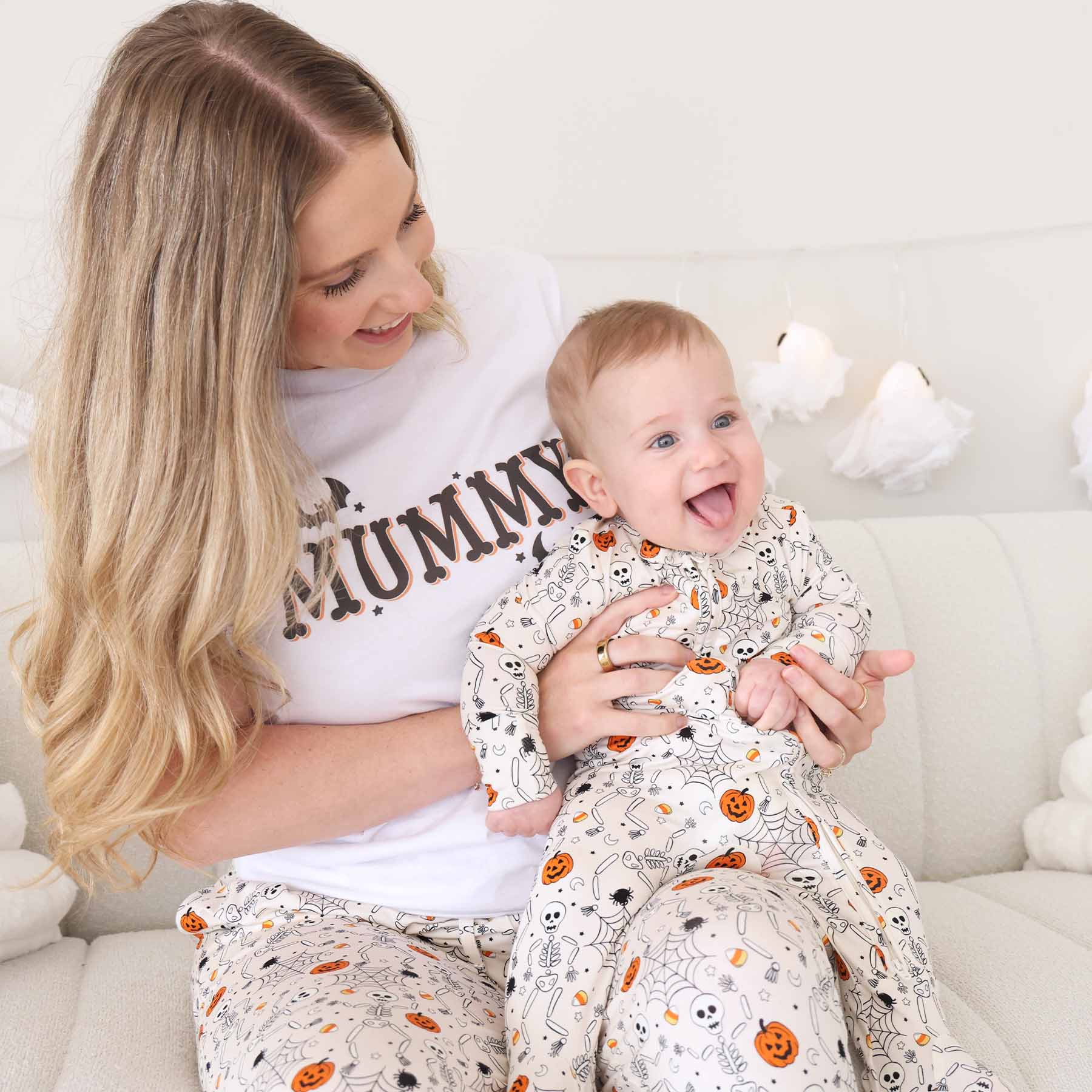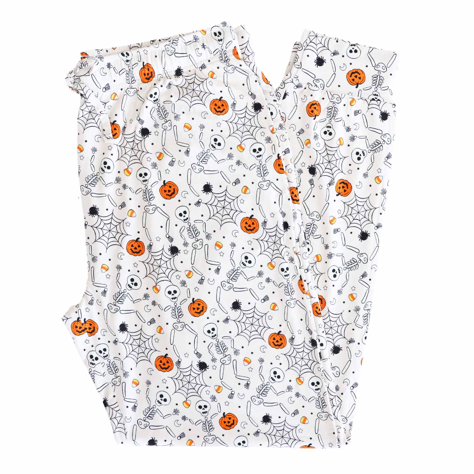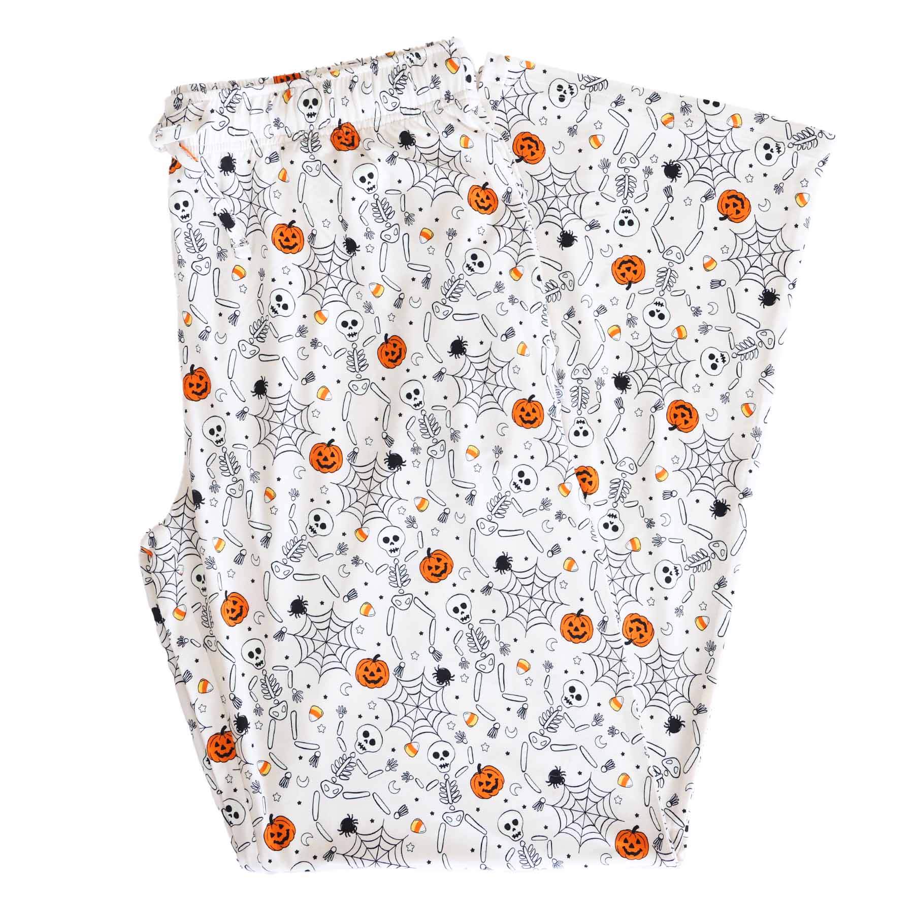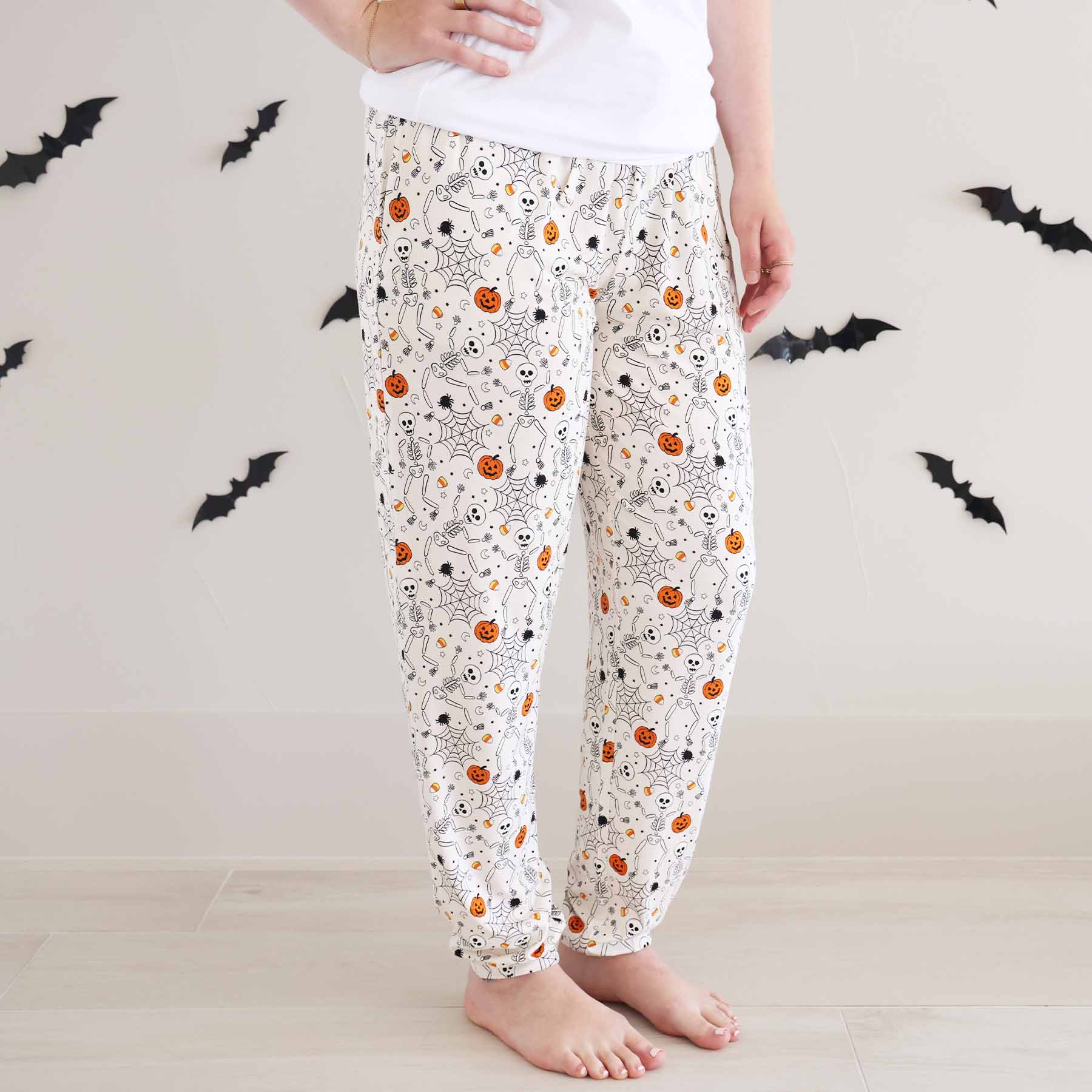 Get ready to glow in spooky-soft comfort! The Silly Skellies adult unisex pajama pants feature a playful Halloween print with dancing skeletons, pumpkins, spider webs, and stars with glow-in-the-dark details that light up your spooky season style. Made from buttery-soft bamboo viscose, these pajama pants are breathable, stretchy, and ultra-comfy for lounging, sleeping, or family matching moments. Available in both jogger and relaxed lounge styles, there’s a fit for every cozy preference.