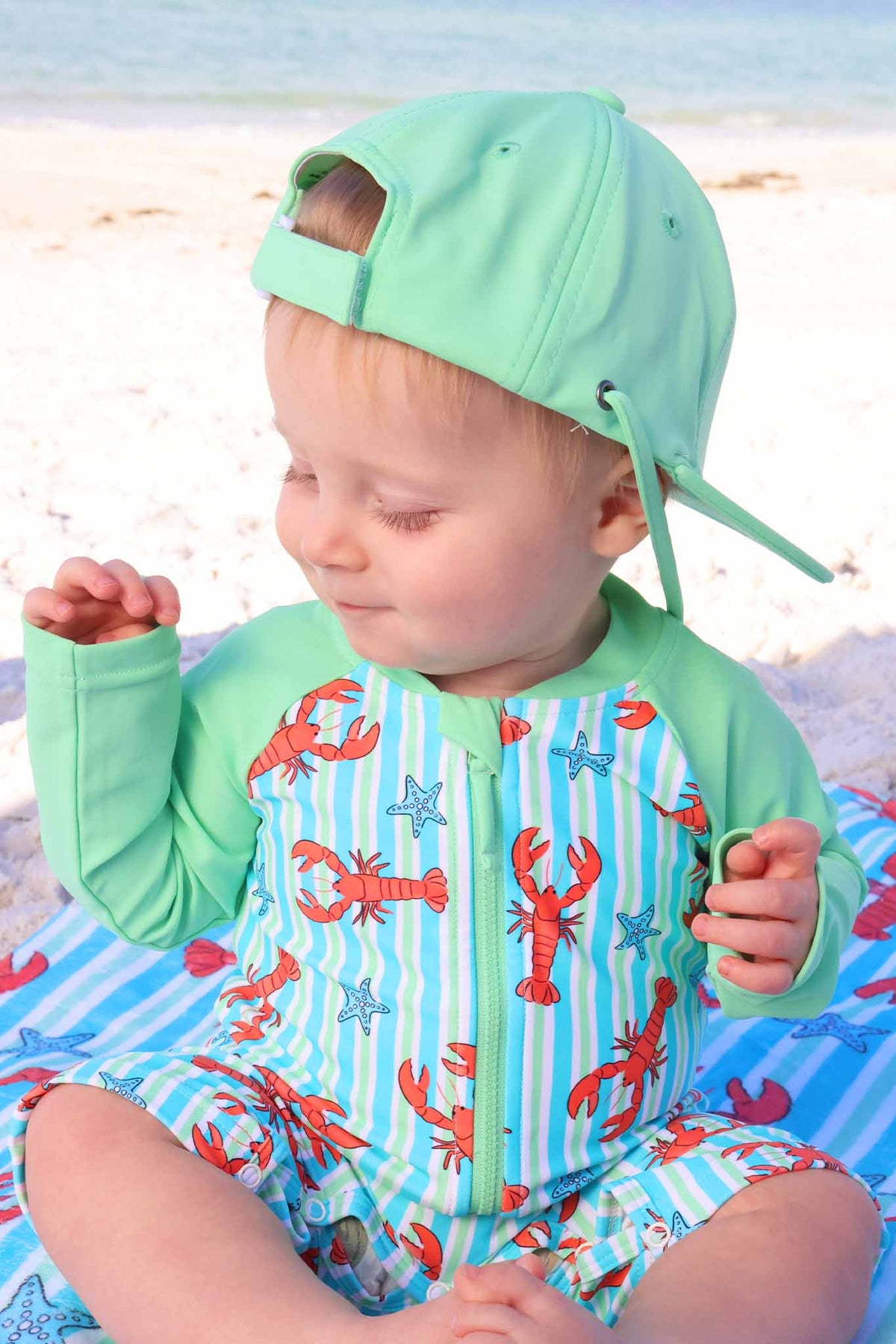 Designed for long beach days and endless sunshine, our Sea Sprout Surf Hat brings easy coastal style to every summer adventure. The bright green feels fresh and playful while pairing perfectly with the Pinch Me swim collection for a look that’s effortlessly coordinated. Made from lightweight, quick-drying swim fabric with built-in sun coverage, this surf hat is designed to keep little faces shaded during sandy play, pool splashes, and seaside strolls. The comfortable fit stays secure through cannonballs and wave chasing, offering protection without getting in the way of the fun.