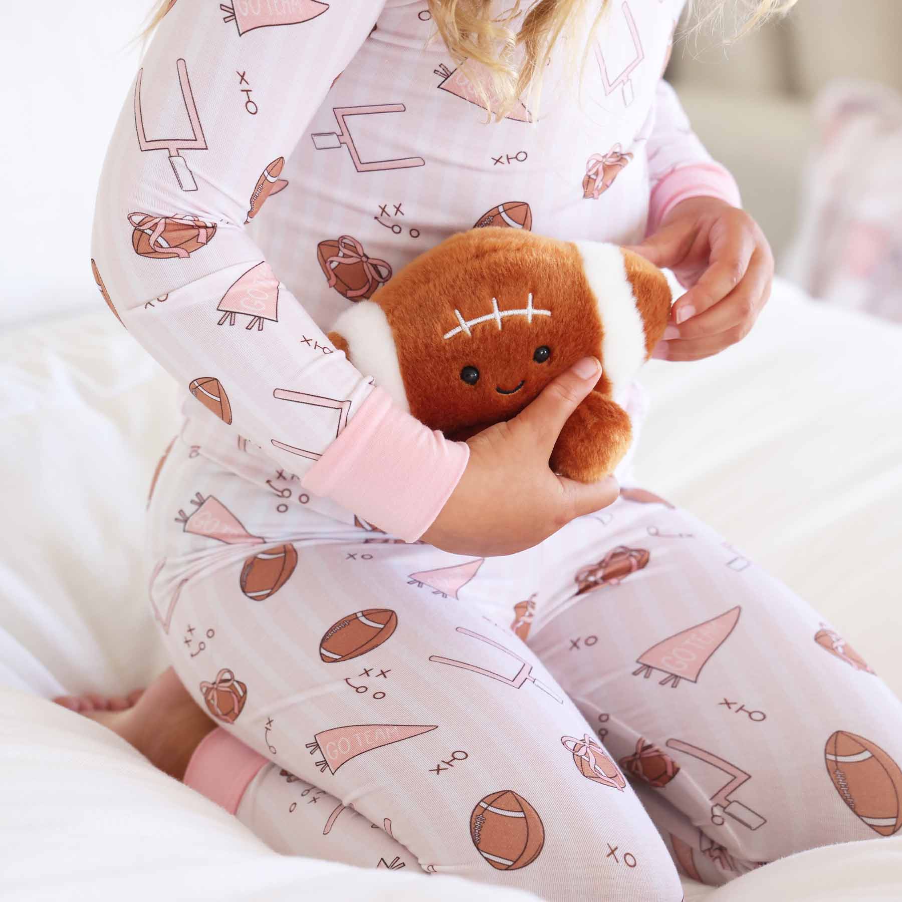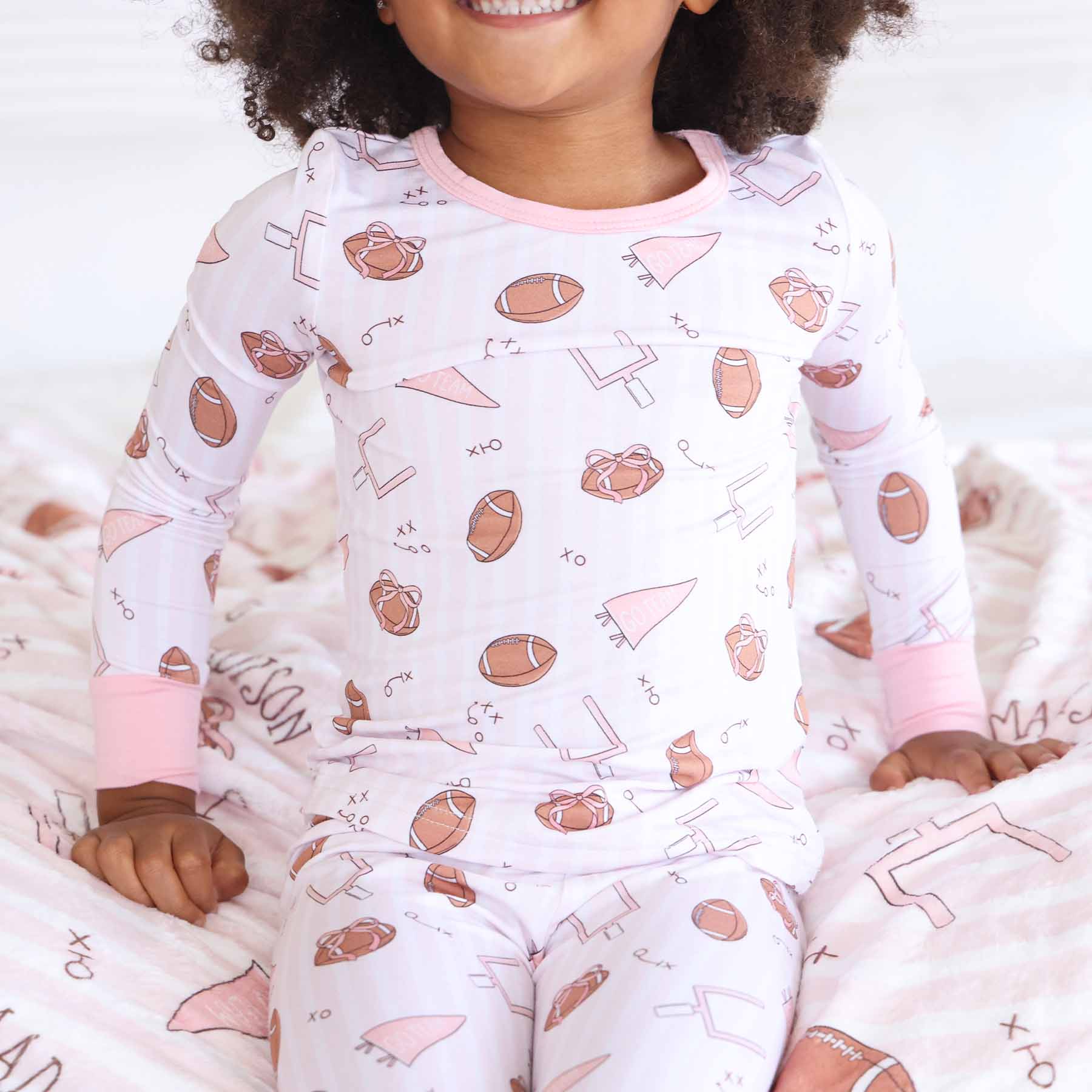 For the girls who love a little pink with their gameday, the Tiny Touchdowns Two-Piece Pajama Set brings a girly twist to football season! Featuring footballs, goal posts and more on a pink striped backdrop, this set is perfect for the girls who love football. Made from a breathable bamboo blend that’s buttery-soft and stretchy, the long-sleeve top and fitted pants are designed for all-night comfort and all-day lounging. Whether it's a sleepover, game day, or slow Sunday morning, this set was made to move, match, and relax in.