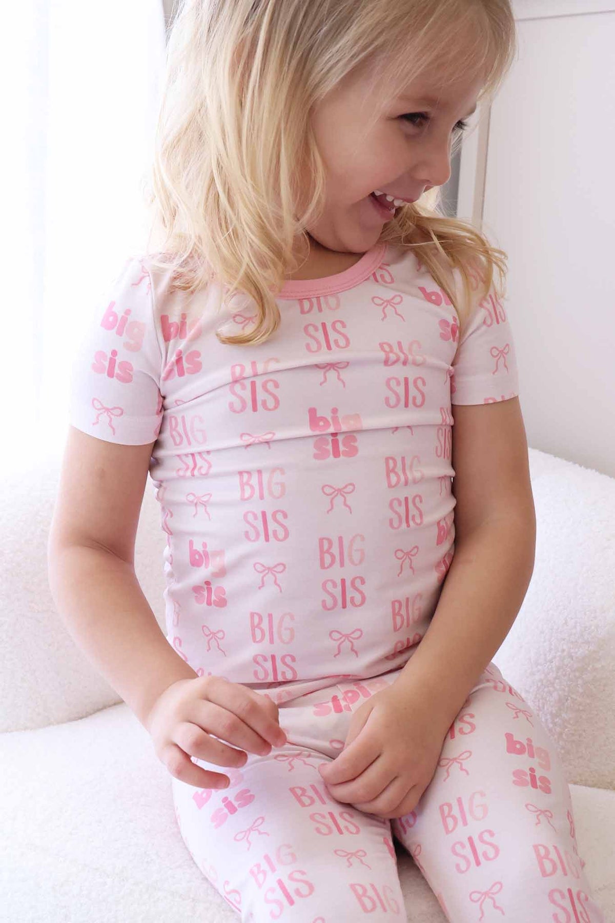 smiling girl in pink two piece short sleeve pajama set with pants in big sis print